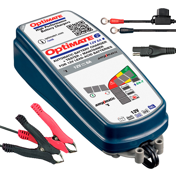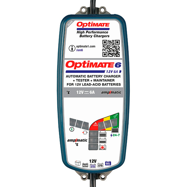 Optimate 6 Ampmatic Silver Series acculader met plug & play automatiseringstechnologie voor 12V loodzuuraccu's voor motorfietsen. Ref. TM-360
