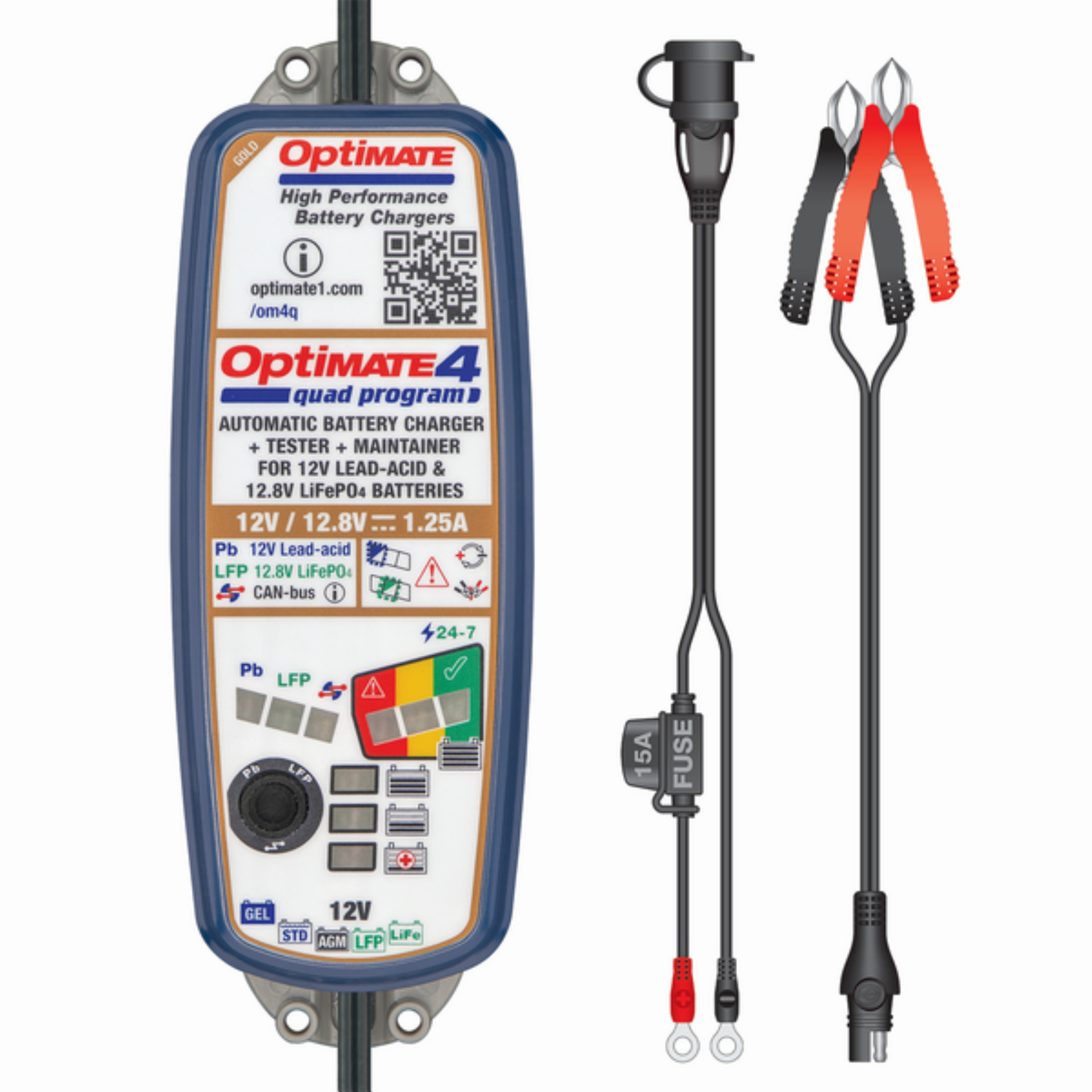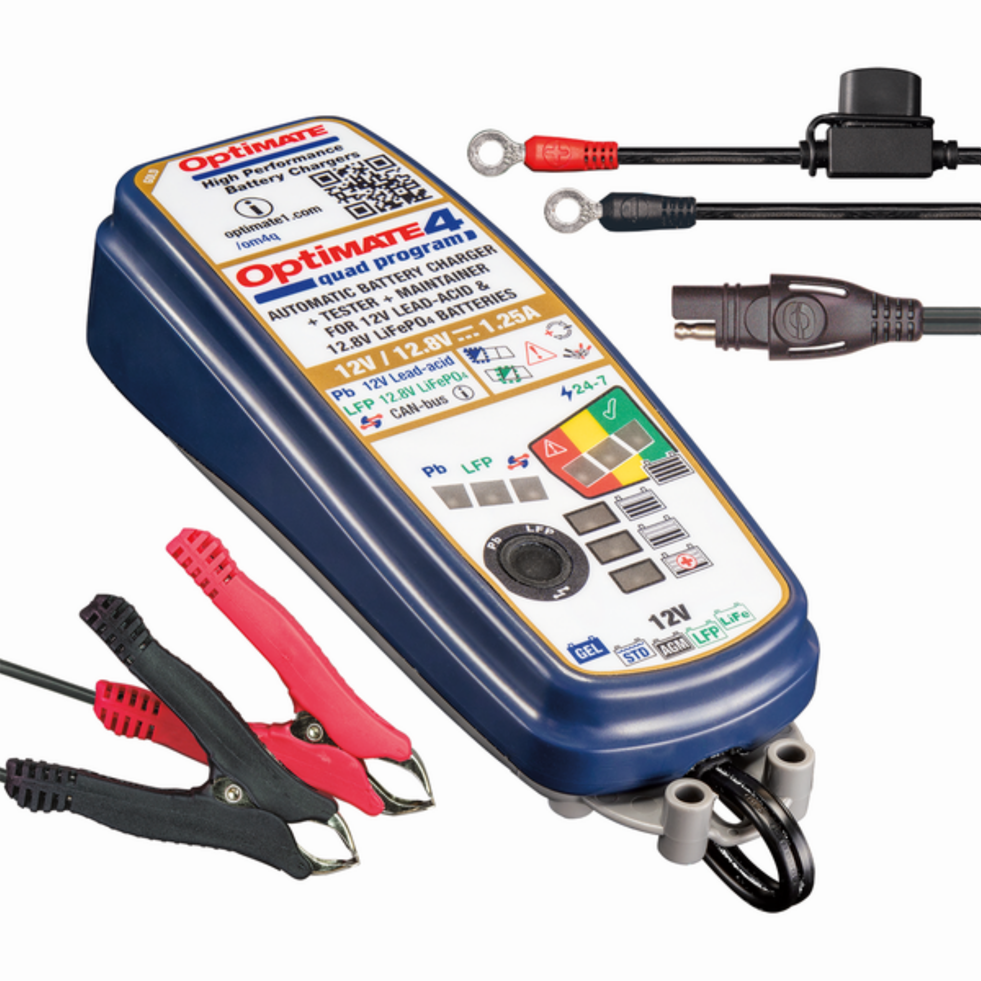 Optimate 4 Quad Program Normal Edition motorfietsacculader, blauw, AGM, gelaccu, 15Ah. Model TM630.