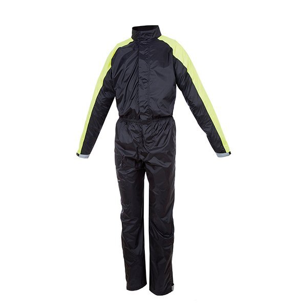 Tucano Urbano Tuta Nano Plus, een volledig waterdicht regenpak, gemaakt uit één stuk met klittenbandsluiting en een compacte draagtas. Reflecterende en contrasterende fluorescerende gele inzetstukken.
